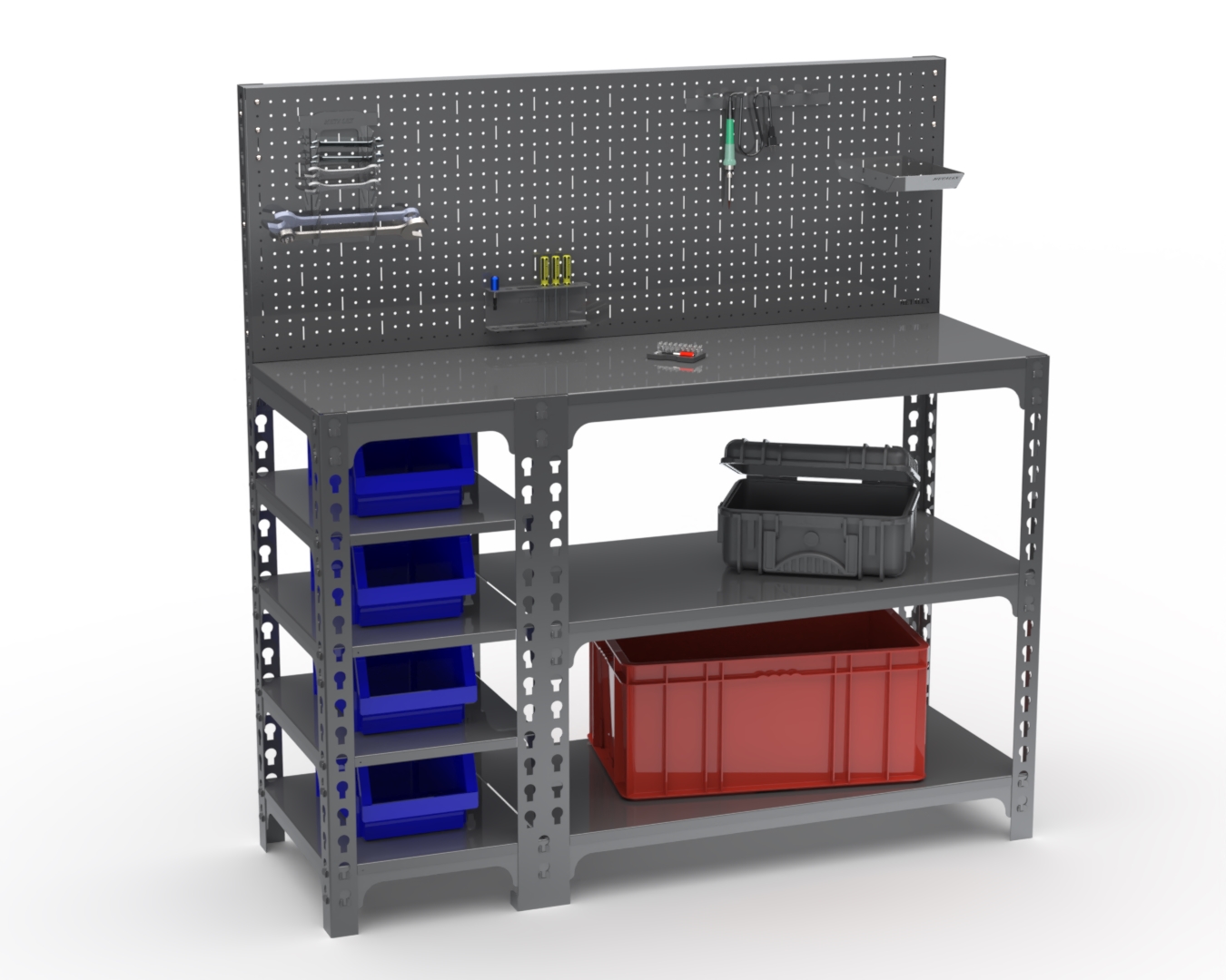 Благодаря своему уникальному дизайну стол-верстак Metalex с боковыми полками и одной перфопанелью обязательно удовлетворит Ваши потребности, когда вы занимаетесь проектами дома или на рабочем месте.