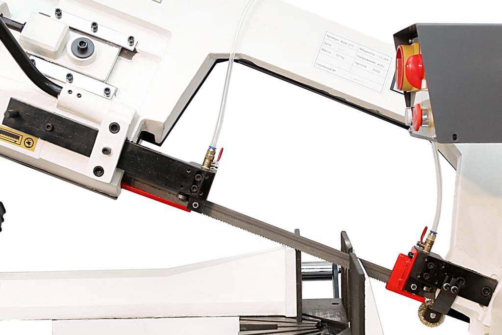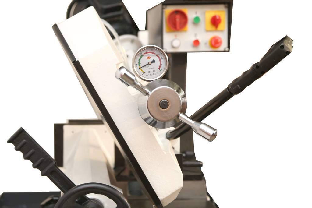 Натяжение пилы осуществляется маховиком по тензометру, что позволяет контролировать натяжение полотна и тем самым получать стабильный рез и продлить срок службы полотна.