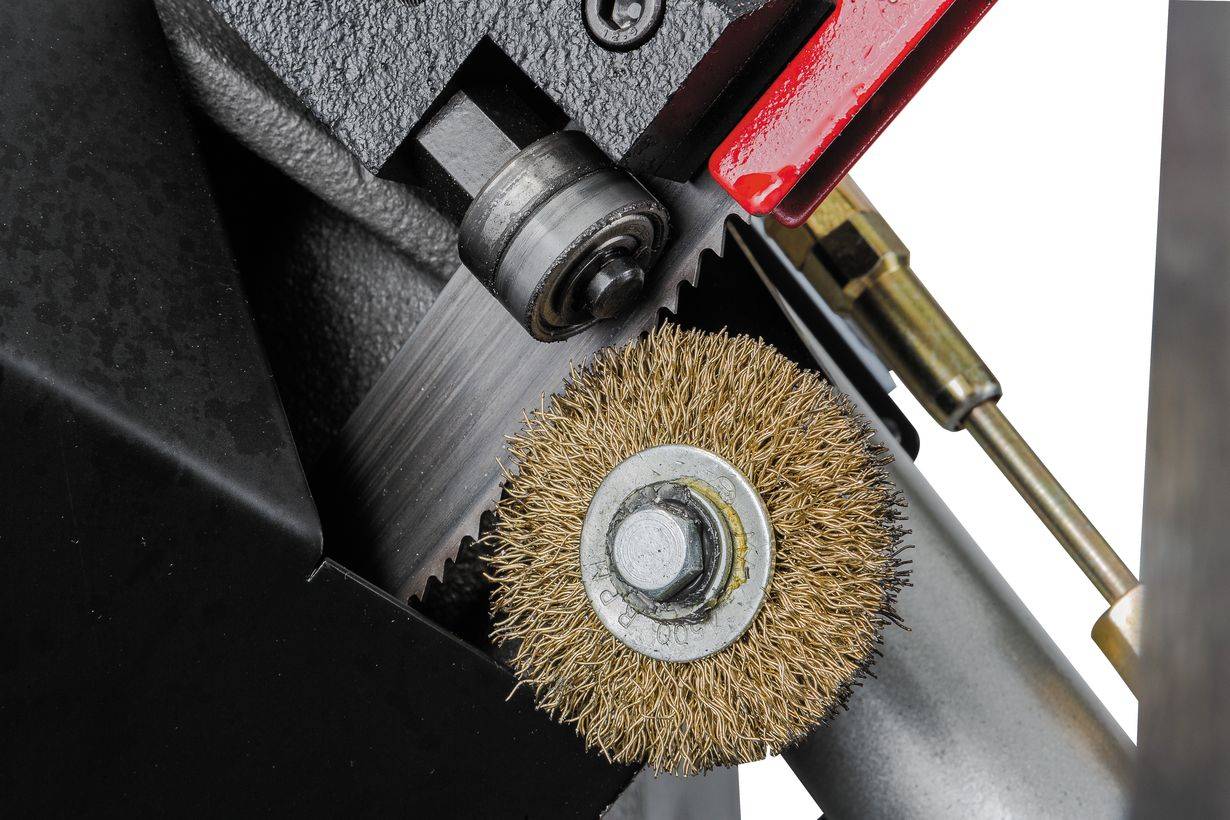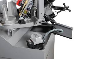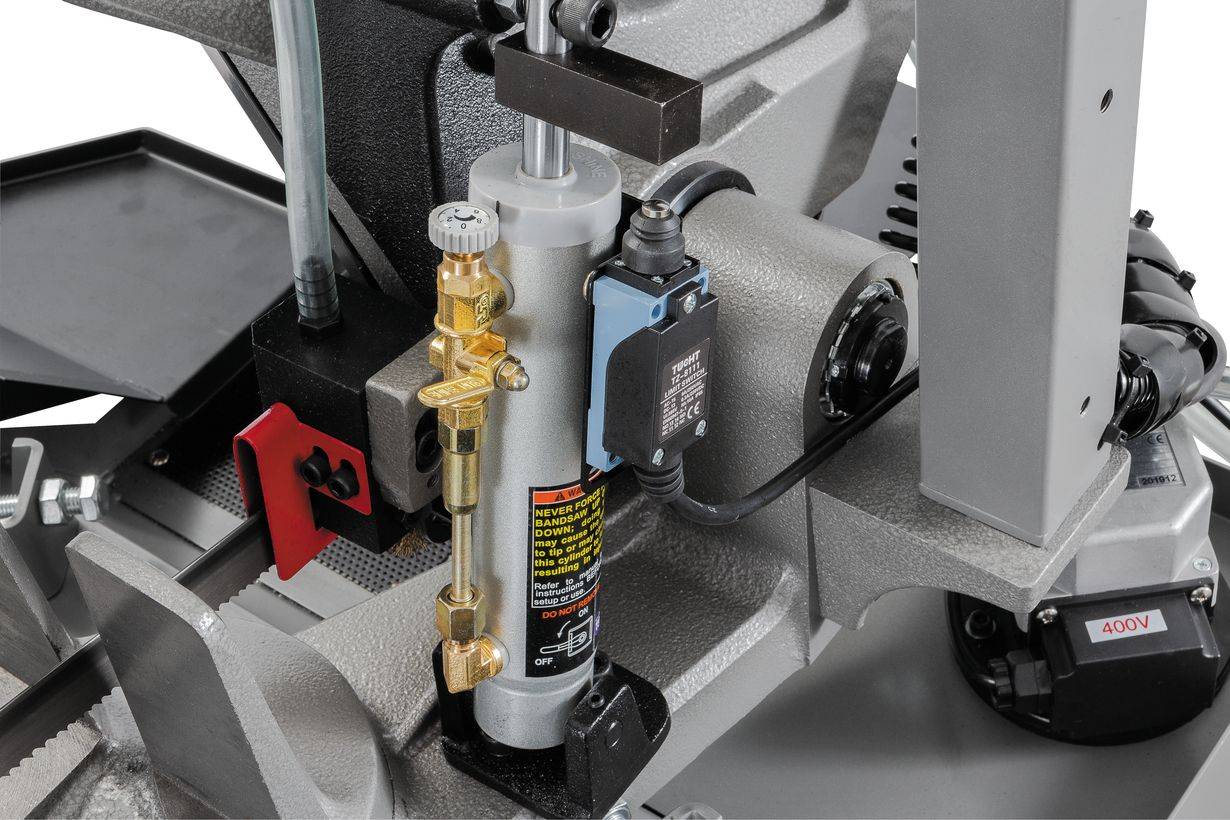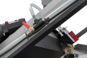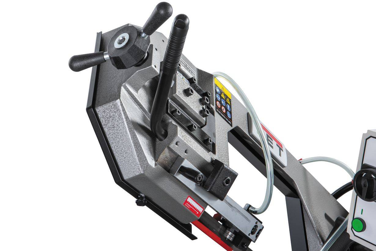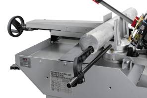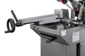 Ленточнопильный станок оборудован быстрозажимными тисками, используя которые можно добиться высокой производительности работ. Консоль станка имеет направляющие, передвижение которых позволяет регулировать проход ленточного полотна, повысить качество распила и ограничить уводку полотна в сторону. Направляющие оснащены подшипниками выполняющими функцию позиционирования ленточного полотна в вертикальном положении относительно обрабатываемой заготовки. Станок имеет тензометр, фиксирующий силу натяжения ленточного полотна. Регулировка силы натяжения осуществляется вручную.