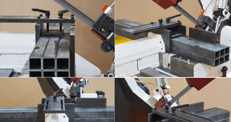 В рабочей зоне резания полотно точно ведется двумя направляющими головками. Станок европейского образца с возможностью поворота корпуса пилы от 0° до +60°, предназначен для пиления заготовок, под различными углами и при частой смене угла пила.