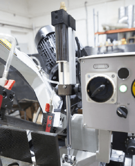 Пила опускается под собственным весом, станок оборудован дросселируемым гидравлическим цилиндром, который позволяет автоматически подстраивать скорость опускания пильной рамы в зависимости от профиля заготовки, что обеспечивает оптимальные режимы распила. Гидравлическая система снабжена электромагнитным клапаном. При нажатии кнопки «пуск» гидравлика опускает раму с заданной скоростью и удерживает раму в любой точке в выкл. состоянии (при этой конструкции - нет необходимости дополнительно перекрывать перепускной клапан демпфера в нижней точке рамы, для последующей установки рамы в любую верхнюю точку).