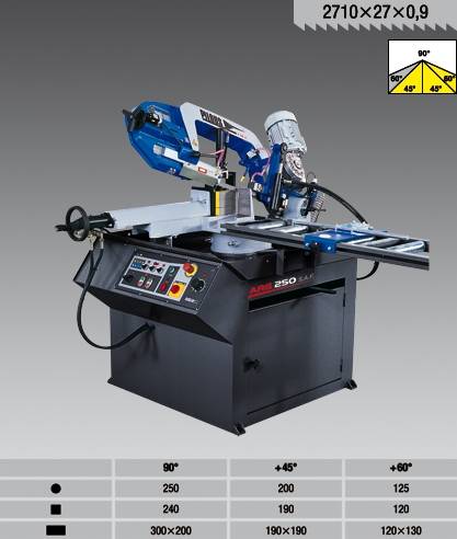 Станок построен по классической схеме полуавтомата. Отличается большой жесткостью, позволяющей пилить заготовки, как из простых конструкционных сталей, так и различных нержавеющих сталей и сплавов. Пильная рама имеет разворот в одну сторону. Тиски раздвигаются на 290 мм., что позволяет пилить прямоугольною заготовку с размерами превышающими рабочий просвет подъема пильной рамы. Модель ARG 250 S.A.F. снабжена частотным регулятором скорости ленты, что позволяет плавно регулировать скорость ленты в диапазоне 15-90 м/мин. Данная опция полезна при пилении цветных материалов и различных сплавов.