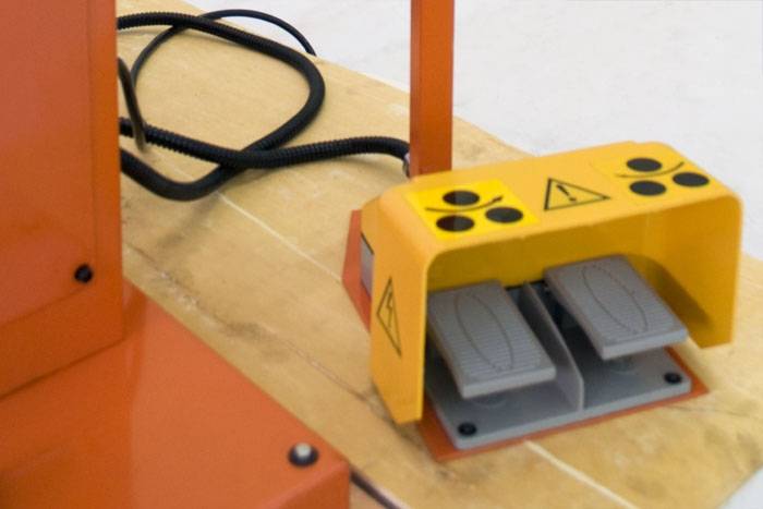 Стойка управления с двумя ножными педалями и кнопкой аварийной остановки, снабжена удобной ручкой для переноски.