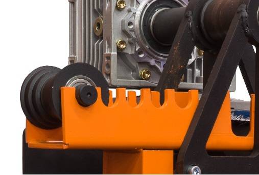 Все три ролика (приводной и прижимные) сделаны из легированной стали. Для работы с радиусной гибкой станок укомплектован тремя вальцами – один верхний, два нижних (прижимных). Они изготовлены из лучшей стали и снабжены подшипниками. Гидравлический домкрат прижимает вальцы до нужного уровня, при этом эти вальцы регулируются по их начальному положению.