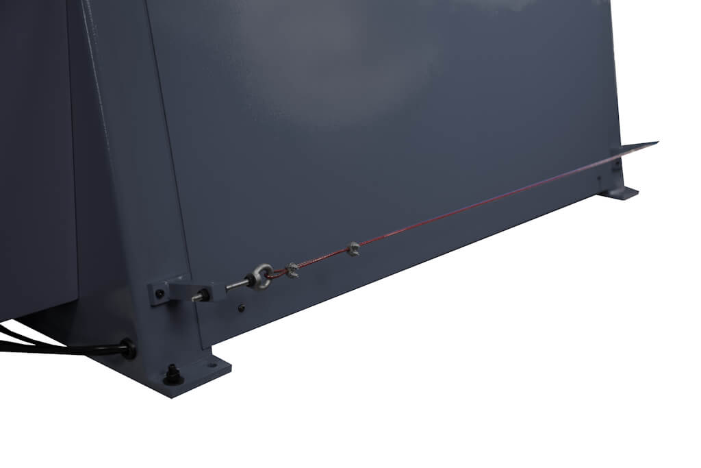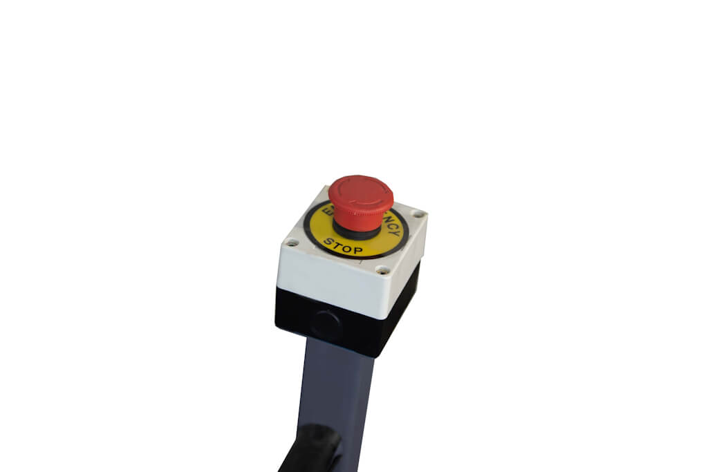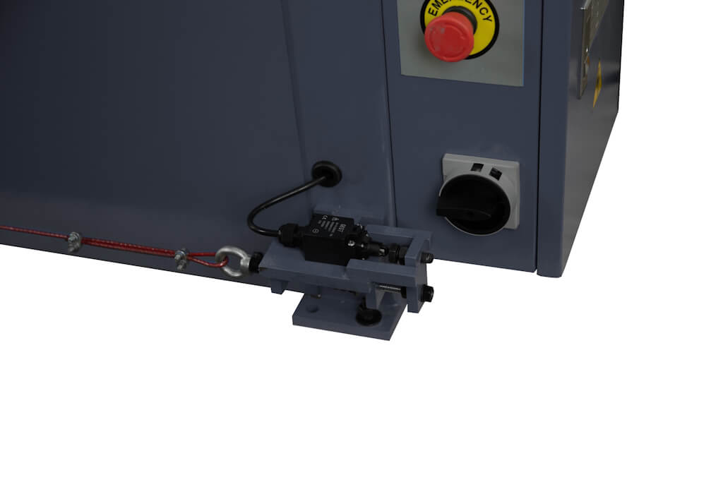 Дополнительная кнопка «аварийный стоп» расположена на передней поверхности электрического шкафа. Там же находится основной выключатель и кнопки включения/выключения машины, а так же индикатор сети и индикатор «работа». Спереди, внизу на станине установлен тросовый выключатель для аварийной остановки валов. Слева, под защитным кожухом находится цепная передача и шестеренный механизм привода валов.